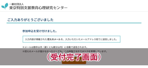 当ページ掲載の申込フォームから申込手続きを行ってください。 フォームに入力し受付が完了すると下記画面が表示されます。 ![]() 続いて申込内容が掲載された確認メール(自動配信)が届きます。 ※メールは数秒以内(遅くとも数分以内)に届きます。 ※送信専用アドレス "" から自動で送信されます。 <受付完了画面が表示されたのに、確認メールが届かない場合> (特にGmail・hotmail・outlook.jp・yahooメール等、フリーメールを利用の方) 受付完了画面が表示された時点で受付自体は完了していますので、確認メールが届かなかったとしても「再度フォームから登録」は行わないでください。 ※二重申込で定員にカウントされ、管理に支障が支障が生じます。 メールが届かない場合、以下の状況が考えられます。 メールアドレスの入力間違い 入力を間違えたかどうかを自身で確認する方法はありませんので、心当たりのある方はメールにてお問い合わせください。 迷惑メールと誤検知され「迷惑メールフォルダ」等に格納された 迷惑メールフォルダ等を確認ください。 ※メールソフトのメニュー欄、"その他""もっと見る"等の中に「迷惑フォルダ」が隠れている場合もあります。 また、お使いのメールサービスプロバイダ(Nifty、OCN 等)によっては各人のパソコンやスマートフォンにメールを受信する前の段階でプロバイダが迷惑メールと誤判断し、各人の端末への受信を保留にしている場合もありますので、各プロバイダのウェブメール画面等で迷惑メールフォルダやゴミ箱フォルダを確認ください。 |
